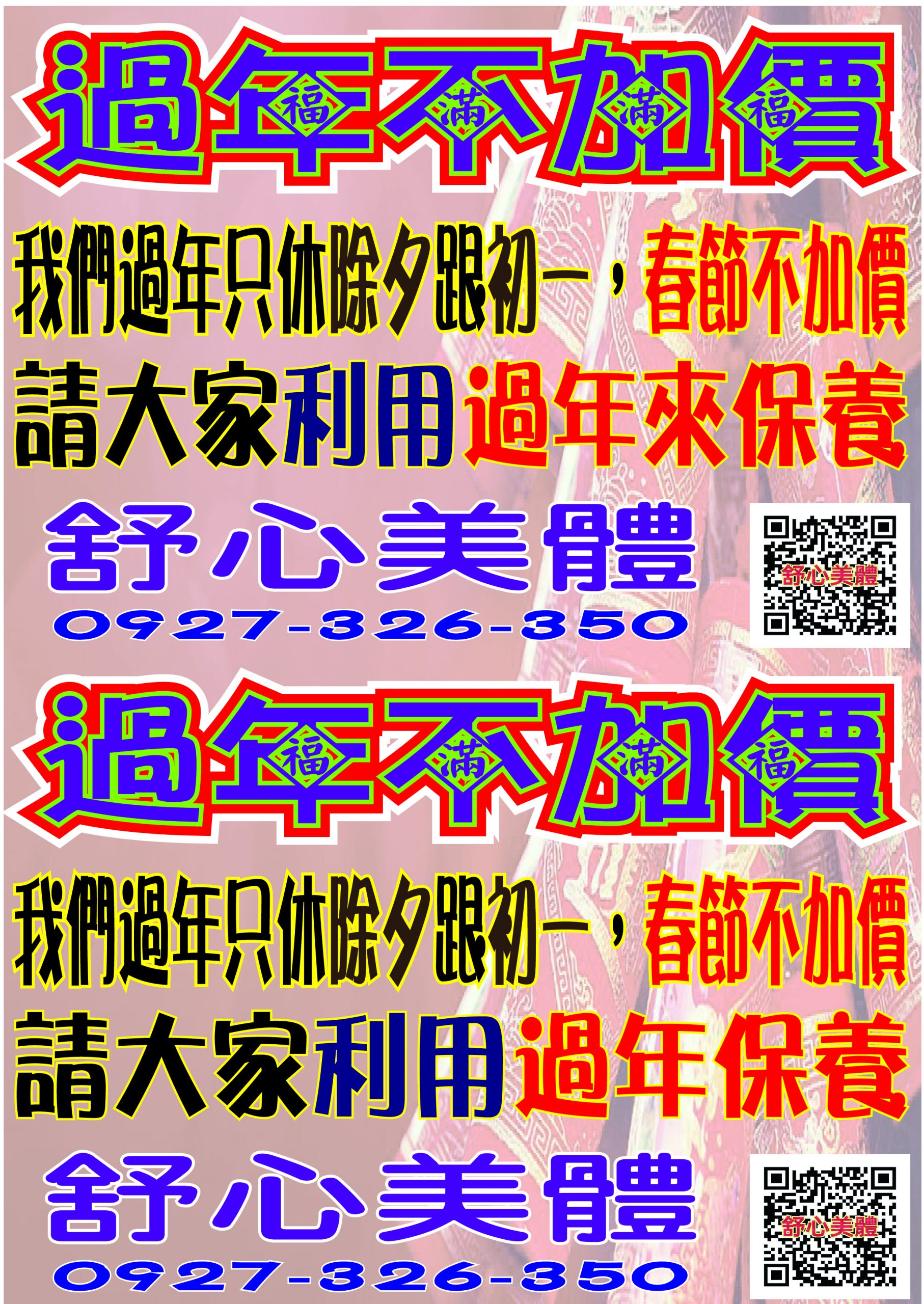 過年不加價 Spread the love 過年不加價我們過年只休除夕跟初一,春節不加價請大家利用過年來保養舒心美體基隆按摩舒心美體官方網站0927-326-350https://lin.ee/LTPXrMz 臉書留言 (總共瀏覽 17 次數, 今天瀏覽 1 次數 )