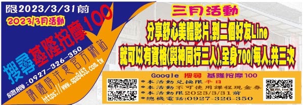 2023/3月活動-與神同行 Spread the love 分享舒心美體影片,到二個好友Line就可以有資格(與神同行三人),全身700元/每人,共三次 *本活動兌換限平日*本活動限2023/3/31前*總機電話:0927-326-350*本活動不可使用課程現金券 臉書留言 (總共瀏覽 111 次數, 今天瀏覽 1 次數 )